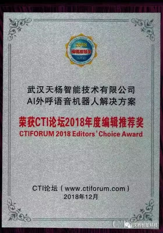最終,天楊智能“AI外呼語音機器人解決方案”獲得CTI論壇2018年度編輯推薦獎。
