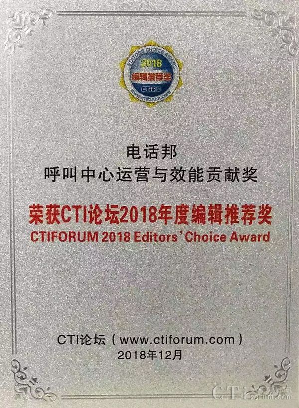 CTI論壇編輯推薦獎是由中國領(lǐng)先的信息和通信技術(shù)行業(yè)網(wǎng)站CTI論壇舉辦的年度ICT領(lǐng)域技術(shù)評選活動,評選范圍涵蓋主要ICT技術(shù)和產(chǎn)品應(yīng)用。評選活動借助媒體獨特的視角,對本年度ICT領(lǐng)域出現(xiàn)的最新技術(shù)和熱門產(chǎn)品解決方案進行一次總結(jié)和集中展示,最后由專家評審決定各個獎項花落誰家。依托CTI論壇多年來積累的強大行業(yè)資源和經(jīng)驗,經(jīng)過一個月的激烈評選和廣泛考察,將這一榮譽授予了電話邦。