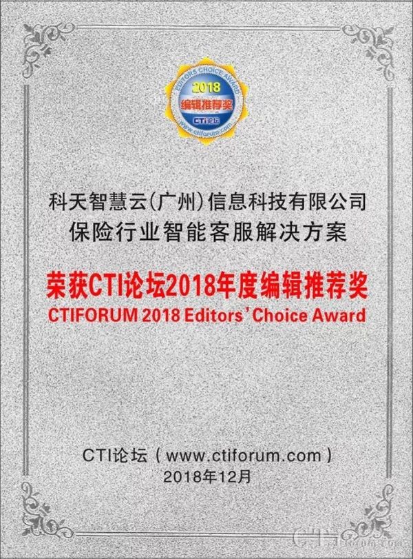 近日,2018年度CTI論壇在北京召開,科天云憑借創(chuàng)新的保險行業(yè)智能客服解決方案榮獲CTI論壇2018年度編輯推薦獎。
