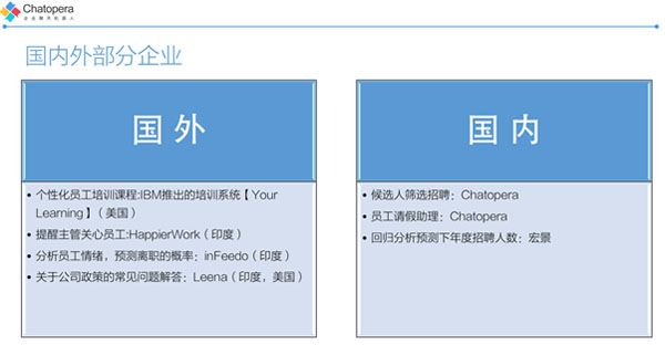 第二個(gè)環(huán)節(jié)是Chatopera聯(lián)合創(chuàng)始人CMO張凱從我國的HR信息化發(fā)展之路這一主線索做了分享。他用一張經(jīng)典的人類進(jìn)化簡圖類比我國HR信息化發(fā)展之路,帶領(lǐng)大家一起回顧了過往的信息化工具和特征;一直到現(xiàn)在AI時(shí)代出現(xiàn)的HR信息化工具,列舉了當(dāng)前國內(nèi)外在HR行業(yè)的部分企業(yè)產(chǎn)品和服務(wù),總結(jié)歸納了AI具體可以為HR在哪些場景做落地,也提到了AI在落地企業(yè)HR行業(yè)時(shí)的四大挑戰(zhàn)。同時(shí)也給出了Chatopera與國外leena.ai在HR招聘候選者的Demo。