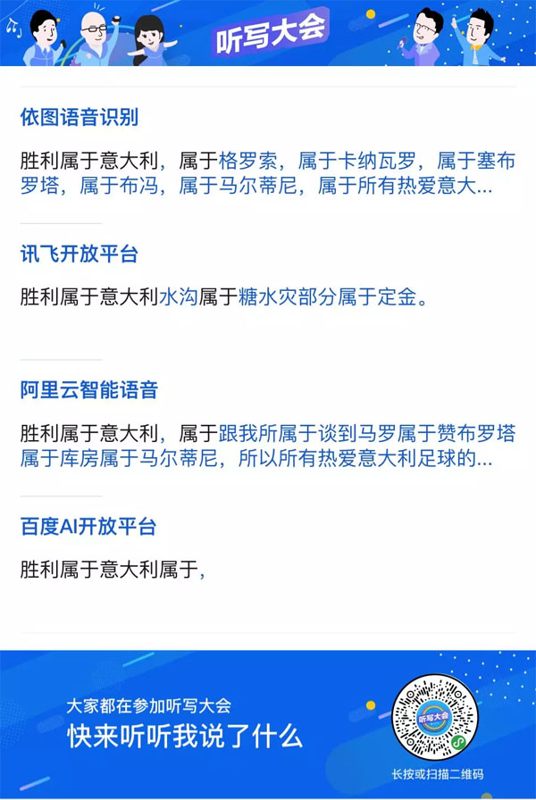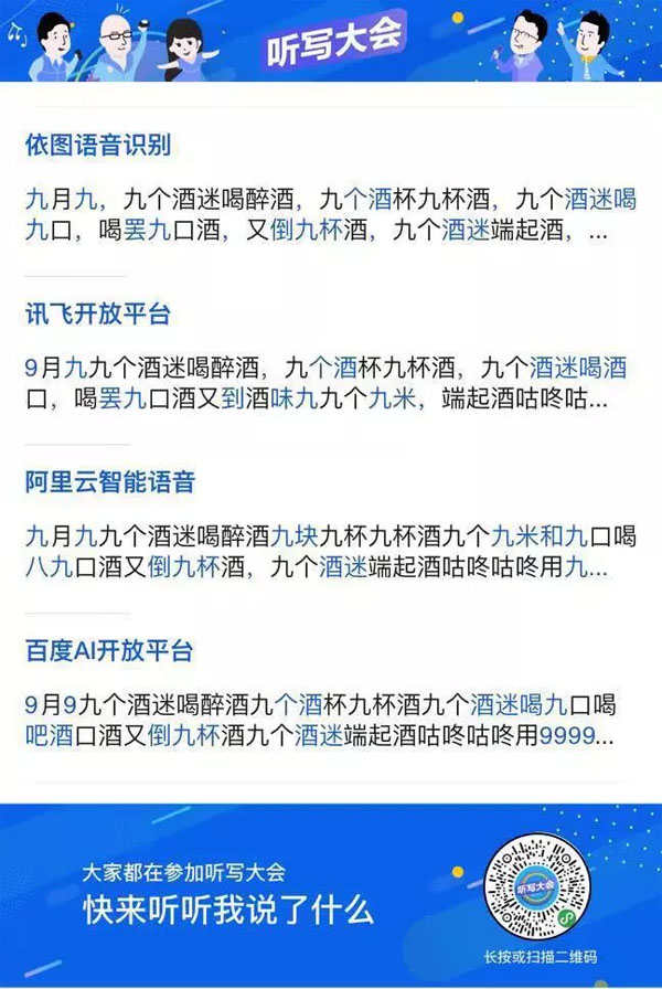 聽(tīng)寫(xiě)大會(huì)小程序一經(jīng)發(fā)布,各種評(píng)(tiao)測(cè)(xi)洶涌而來(lái)。依圖語(yǔ)音憑借自身優(yōu)秀的技術(shù),展現(xiàn)了極其穩(wěn)定的語(yǔ)音識(shí)別能力。
