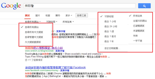 我們先來復習一下以往我們最常使用的搜尋方式,直接輸入搜尋的關鍵字,頂多選擇搜尋所有網(wǎng)站還是繁體中文、時間點、再來就是以簡單的空白鍵區(qū)隔不同關鍵字,但仍然很難在搜尋結果中迅速鎖定目標。