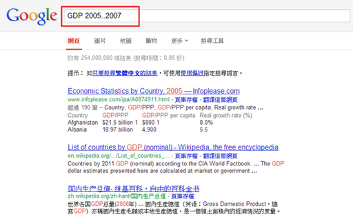 這通常會用在查找新聞或某一段區(qū)間的數(shù)據(jù)時,比方我想搜尋2005年到2007年的GDP數(shù)據(jù),如果打GDP可能要從許多資料中去撈出我想要的結果,但如果輸入的是GDP 2005..2007,那就可以搜尋某個期間內(nèi)的資料。