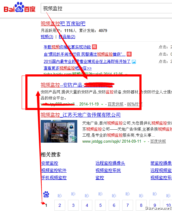 當(dāng)時(shí)就針對(duì)這個(gè)關(guān)鍵字所對(duì)應(yīng)的URL做了幾個(gè)同行友情鏈接,錨文字就以“視頻監(jiān)控”為關(guān)鍵字而鏈接就以該關(guān)鍵字所對(duì)應(yīng)的URL,又選擇了幾個(gè)權(quán)重比較好的博客并且這幾個(gè)博客也沒(méi)有添加rel=“nofollow”標(biāo)簽。撰寫(xiě)了幾篇與關(guān)鍵字“視頻監(jiān)控”相關(guān)的文章發(fā)布到博客中,在文章中選擇一個(gè)“視頻監(jiān)控”關(guān)鍵字做上錨文字指向該關(guān)鍵字所對(duì)應(yīng)的頁(yè)面。堅(jiān)持每天所更新的博客中只要出現(xiàn)“視頻監(jiān)控”這個(gè)關(guān)鍵字就做上錨文字或直接留下對(duì)應(yīng)頁(yè)面的URL,這樣持續(xù)做了兩周“視頻監(jiān)控”關(guān)鍵字就從100名以外跳躍到了百度搜索首頁(yè)如下圖所示: