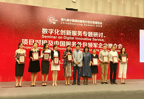 9月26日,大會首先舉行了“2018數(shù)字化創(chuàng)新服務(wù)專題研討、項目對接及中國服務(wù)外包領(lǐng)軍企業(yè)推介會”,中國國際投資促進會會長、商務(wù)部原副部長馬秀紅等領(lǐng)導(dǎo)出席?,F(xiàn)場舉行頒獎儀式,對2018年在服務(wù)外包領(lǐng)域表現(xiàn)優(yōu)異的企業(yè)進行頒獎,鴻聯(lián)九五榮獲“2018年度中國服務(wù)外包金融行業(yè)領(lǐng)軍企業(yè)”以及“中國服務(wù)外包百強企業(yè)”等兩項大獎,張雅總代表公司領(lǐng)獎。