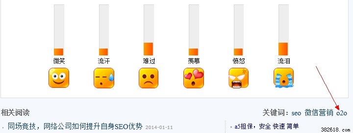 如筆者近期在A5站長網(wǎng)發(fā)表的兩篇關(guān)于O2O的文章“利用SEO和微信打通O2O的商業(yè)脈絡(luò)”、“如何利用O2O敲響跨業(yè)營銷大門?”,只要點擊進去后,就可以發(fā)現(xiàn)文章的底部,“相關(guān)閱讀”欄目旁邊有一列寫著“關(guān)鍵詞”的地方,如圖2。