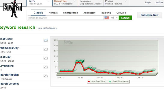 SpyFu – Provides search volume, number of clicks per day and their average daily cost, the actual number of advertisers currently bidding on the keyword and the actual AdWord ads that are running (click to enlarge).