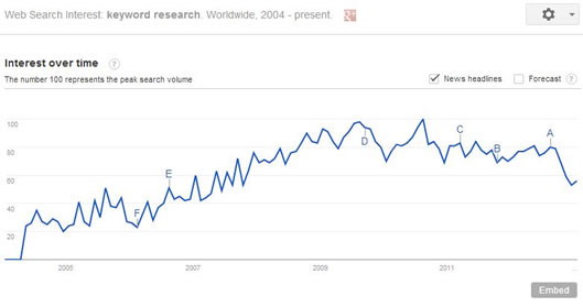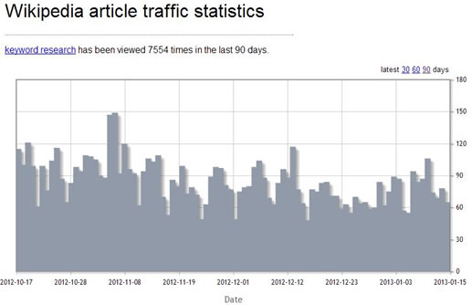 Pay attention to the average index of interest over time, since it can be a bit confusing; 100 here represents the highest search volume there has ever been, it is not the integer for number of searches. So what you are looking for is that the current interest has not fallen off completely, looking at the graph it seems the current search volume for keyword research is down about 50% from what it was in August 2010. Next you use a bit of a 3rd party litmus test to see how popular a topic really is, and a safe bet here is to use the worlds most popular encyclopedia, Wikipedia. Domas Mituzas has built a statistical engine that tracks Wikipedia’s pageviews. And looking at it over the past 90 days we can see that the term has been viewed 7,554 times (hat tip to Glen Allsopp for sharing this). Click to enlarge.
