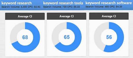 Using our quick and dirty evaluation model of (exact monthly search volume x (1 – CI%) we get:keyword research opportunity score (4,400 x (1-.68)) = 1,408 keyword research tools opportunity score (720 x (1-.65)) = 252 keyword research software opportunity score (480 x (1-.56)) = 211.2 Showing (quickly remember) that even though keyword research is significantly harder in terms of competition, it is still the clear winner in terms of keywords to target for search traffic. This is useful because it takes it takes into account the opportunities as related to monthly search volume and then discounts the traffic potential based on the average competition.