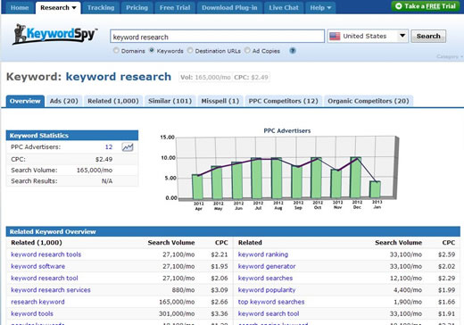Keyword Spy - Is one of my favorites for getting a quick sense of the landscape. It very quickly (through use of tabs) gives you access to data on PPC ads, related keyword phrases, your paid and organic competitors, andmy favorite; misspellings! Did you know that keyword reserach has an estimated 110,000 searches per month! See a screenshot of the dashboard below (click to enlarge).