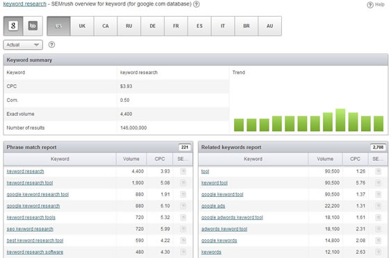 This is really helpful because it captures all of the potential permutations related to your target keyword based onactual search behavior. You can now drill down into phrases and select the child keywords to be added to a list. Then click the ‘get’ button to generate a modal window that allows for you to copy and paste. Paste your selected related keyword back into the google keyword tool and rerun for more keyword data goodness. Tip: I’ve found that the Google keyword tool provides more suggested keywords when you put in less than 10 keywords at a time. Wordtracker also has a keyword suggestion tool although to really get any of the juice out of it you need to sign-up for a paid plan :/ There are also a variety of tools that provide keyword usage and competitiveness between both paid and organic search – some of which are pretty good. SEMrush - Gives you fantastic insight into search volume, average cost per click, number of competing pages, related keywords, rank results, and even companies currently buying ad space (click to enlarge).