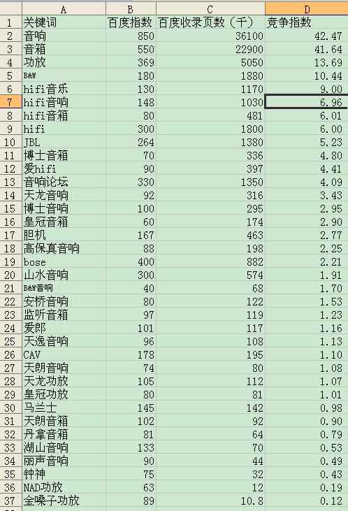 5、從這張表格可以看到,“音響”和“音箱”這2關(guān)鍵詞高高居上,就像北京奧運(yùn)會的中美兩國一樣形成第一梯隊(duì)。去百度搜下,這兩關(guān)鍵詞前幾頁都是各大網(wǎng)站首頁,其中不乏些門戶網(wǎng)站,比較難做。