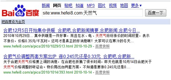 上圖僅表示在www.hefei8.com中包含天然氣這個(gè)關(guān)鍵詞的信息,這樣可以更加精準(zhǔn)的查看到相關(guān)信息,常用于精準(zhǔn)搜索。