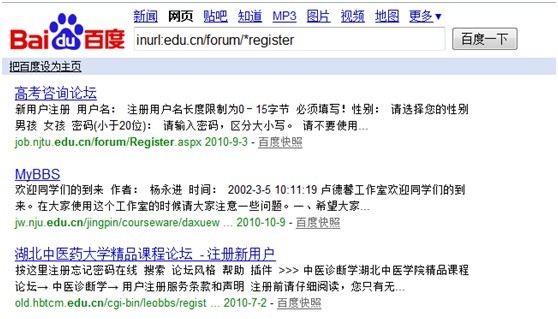 此條指令可能很多人不明白是什么意思,“inurl”——網(wǎng)址中包含edu.cn的網(wǎng)站同時(shí)含有forunm和register這2個(gè)單詞,*為通用符。因?yàn)榇蠹页S胒orunm和register表示注冊(cè)頁(yè)面。最終表達(dá)的意思所有教育類網(wǎng)站的注冊(cè)頁(yè)面,這樣很容易找到高價(jià)值的論壇來(lái)供大家發(fā)布外部鏈接