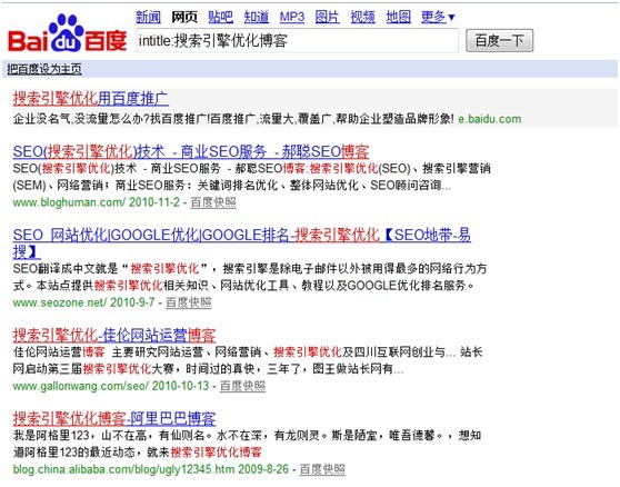 上圖為未增加intitle指令的搜索引擎結(jié)果,大家很容易發(fā)現(xiàn)只要在description或keyword或者正文有此關(guān)鍵詞都有可能被返回搜索結(jié)果,而運(yùn)用了intitle之后如下圖,很容易看到搜索結(jié)果必須是在網(wǎng)站的title中包含關(guān)鍵詞才被返回。這條命令的最大價(jià)值在于對(duì)某個(gè)關(guān)鍵詞更加深入的了解競(jìng)爭(zhēng)對(duì)手(大家都說(shuō)title很重要嘛)。