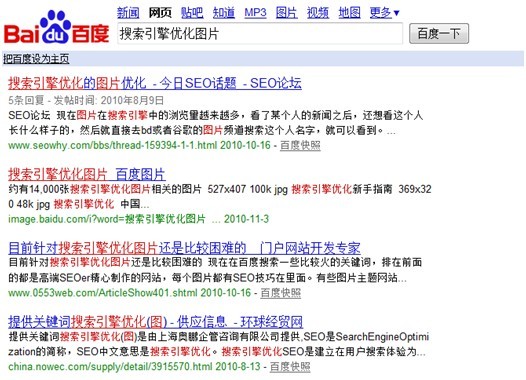 在輸入了含有雙引號(hào)的關(guān)鍵詞后,返回的結(jié)果是完全匹配了關(guān)鍵詞“搜索引擎優(yōu)化圖片”文字的結(jié)果,而下面的圖片則是包含關(guān)鍵詞“搜索引擎優(yōu)化圖片”且可能是分詞或組合詞的結(jié)果