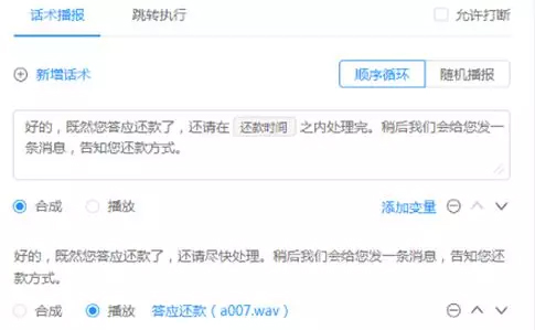 系統(tǒng)提供語音合成和人工錄音兩種播報選擇:人工錄音情感飽滿、施壓有力,更真實;語音合成適用于變量播報,例如人名、稱謂、金額等的自動合成。