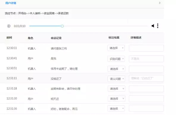 需要詳細了解通話內容時,可展開通話,調聽錄音,查看文字。如果語音識別有錯誤時,用戶可以將正確結果填寫到對應描述框中,實現文本的學習和優(yōu)化,從而不斷提高機器人的外呼效能。