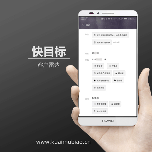 雷達(dá),離客戶更近一步。銷售與客戶的初次談話往往受限于信息不對(duì)稱,能夠結(jié)合客戶的需求來講產(chǎn)品,才能引起客戶的注意??炷繕?biāo)讓銷售從拿到客戶的手機(jī)號(hào)碼、名片開始,在現(xiàn)場就能實(shí)現(xiàn)客戶對(duì)背景情報(bào)的收集。啟動(dòng)客戶雷達(dá)功能,一個(gè)手機(jī)號(hào)碼快速查QQ、微信、支付寶,百度查等;還可以用查工商信息、查地址和定位,百度查企業(yè)信息等,與客戶做現(xiàn)場確認(rèn)。