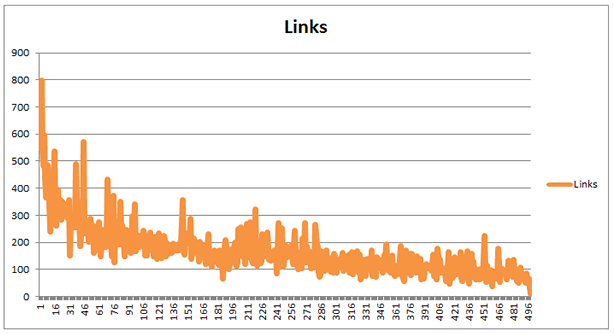 下圖是每個(gè)字?jǐn)?shù)段下博文數(shù)量和外鏈數(shù)量的關(guān)系(縱軸是外鏈數(shù)量,橫軸是博文數(shù)):