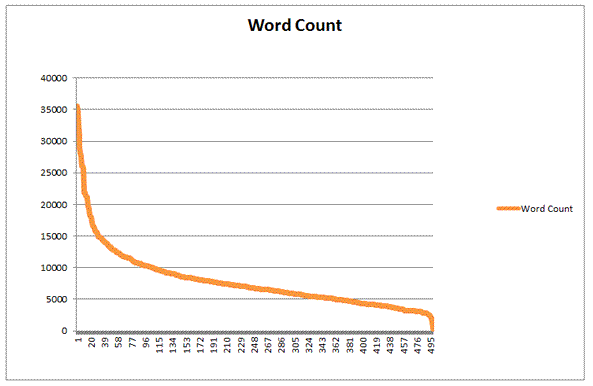 下圖是SEOmoz每個(gè)字?jǐn)?shù)段的博文數(shù)量(縱軸是字?jǐn)?shù),橫軸是博文數(shù)):