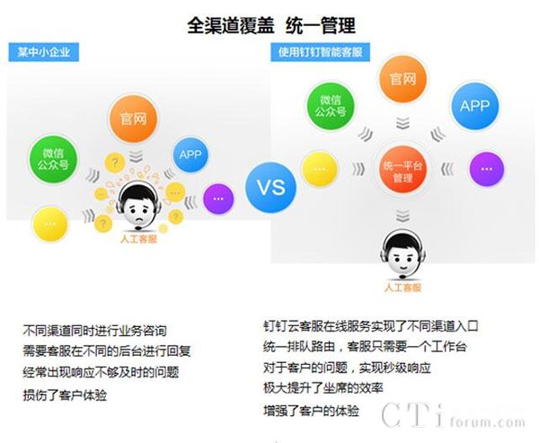 釘釘這次推出的智能云客服,具有全渠道覆蓋、人工智能機器人、可視化后臺三大特性??稍谌?4小時自動響應(yīng)客戶咨詢,機器人通過學習自動提高應(yīng)答準確率,對比純?nèi)斯せ貜?fù)提升了5倍的服務(wù)效率。