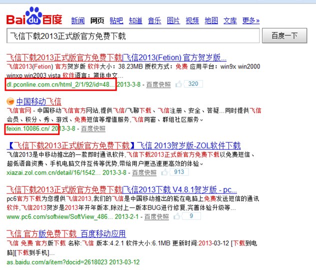 值得一提的是,有很多下載站通過這種手段在蹭流量。看看這個詞“飛信下載2013官方免費(fèi)下載”,我相信用戶是不會主動輸入這么長的關(guān)鍵詞。到百度一查,真相出來了:第一位是太平洋電腦網(wǎng)的頁面,哈哈,你懂的。
