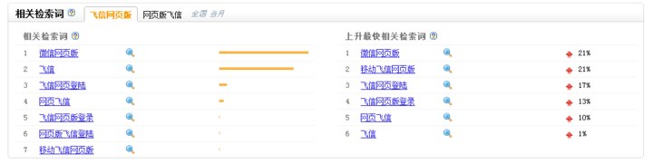 可以通過作弊的方法,將你期望的關(guān)鍵詞刷到熱門關(guān)鍵詞的聯(lián)想菜單,例如,用戶輸入“飛信”,聯(lián)想菜單第二條就是“飛信網(wǎng)頁版”,以此提升主關(guān)鍵詞的曝光量。