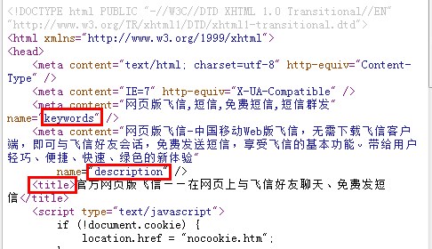 例如:官方網(wǎng)頁版飛信——在網(wǎng)頁上與飛信好友聊天、免費(fèi)發(fā)短信 (現(xiàn)在線上的title就可以,不需要大改,可以考慮把長破折號改為短橫線“-”,雅觀)