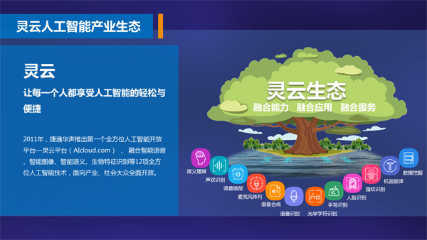 作為人工智能產(chǎn)業(yè)開(kāi)拓者與領(lǐng)導(dǎo)者,捷通華聲自2000年成立以來(lái),一直從事AI核心技術(shù)的研究與產(chǎn)業(yè)化應(yīng)用,是中國(guó)最早從事智能語(yǔ)音、智能圖像研究與應(yīng)用的企業(yè)之一。2011年,捷通華聲推出國(guó)內(nèi)外第一個(gè)全方位人工智能開(kāi)放平臺(tái)—靈云平臺(tái)(AIcloud.com),融合智能語(yǔ)音、智能圖像、智能語(yǔ)義、生物特征識(shí)別等12項(xiàng)全方位人工智能技術(shù),面向產(chǎn)業(yè)、社會(huì)大眾全面開(kāi)放,服務(wù)企業(yè)上千家。