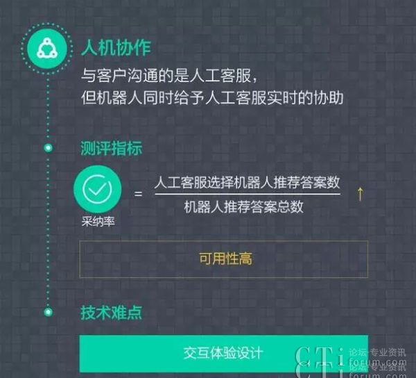作為人工智能應(yīng)用方面的企業(yè)級(jí)服務(wù)先行者,環(huán)信CEO劉俊彥認(rèn)為:“在中國(guó)目前的環(huán)境,錦上添花的AI功能叫好不叫座,客戶缺乏付費(fèi)意愿。AI只有做到真正替代人工或者完全自動(dòng)化一個(gè)企業(yè)的流程,甚至創(chuàng)造出一個(gè)全新的更具效率的業(yè)務(wù)流程,才會(huì)有客戶大規(guī)模買單。”而在客戶服務(wù)行業(yè),當(dāng)用戶請(qǐng)求接入后,先由智能客服機(jī)器人解答80%的常見問題,剩下20%復(fù)雜問題再由真人專家客服來回答解決。智能客服機(jī)器人創(chuàng)造的整套流程已經(jīng)完全改變了整個(gè)客服行業(yè)的勞動(dòng)力結(jié)構(gòu)和工作方式,正如自動(dòng)駕駛未來終將徹底改變整個(gè)交通出行和汽車制造行業(yè)。
