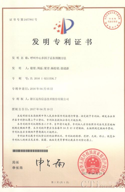 近日,遠傳技術(shù)收獲國家知識產(chǎn)權(quán)局頒發(fā)的三項發(fā)明專利證書,分別為“呼叫中心多因子話務(wù)預(yù)測方法”、“基于文本分析的停電原因識別系統(tǒng)”和“智能排座系統(tǒng)”。