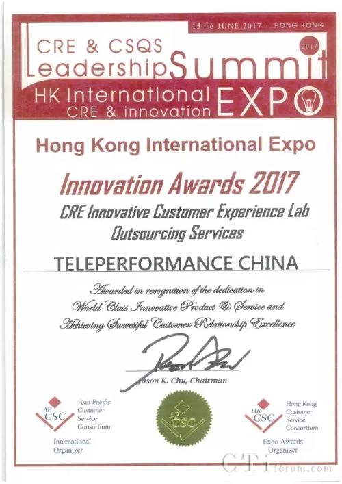 “我們很榮幸能夠獲得博覽會(huì)創(chuàng)新獎(jiǎng)的‘CRE創(chuàng)新顧客體驗(yàn)實(shí)驗(yàn)室外包服務(wù)獎(jiǎng)’!在提供專業(yè)客戶服務(wù)的領(lǐng)域,我們一直在力求運(yùn)用創(chuàng)新,做到更好”。Teleperformance China CEO衛(wèi)振雄先生講到:“作為客戶服務(wù)管理方面的全球領(lǐng)導(dǎo)者,Teleperformance已經(jīng)持續(xù)40年為世界各地的客戶提供專業(yè)的外包客服解決方案。2017年,Teleperformance China互聯(lián)企信進(jìn)入中國市場(chǎng)也已經(jīng)有10周年了,我們不斷完善,提供包含語音、郵件、聊天、視頻、機(jī)器人應(yīng)答與聊天、社交媒體等等的全管道客戶服務(wù)。我們的CX-lab(客戶服務(wù)體驗(yàn)研發(fā)中心)每年通過大量的研究與調(diào)研來了解各行各業(yè)用戶使用習(xí)慣,為我們的客戶提供個(gè)性化的客戶服務(wù)解決方案。同時(shí),我們也相信Teleperformance China互聯(lián)企信未來會(huì)