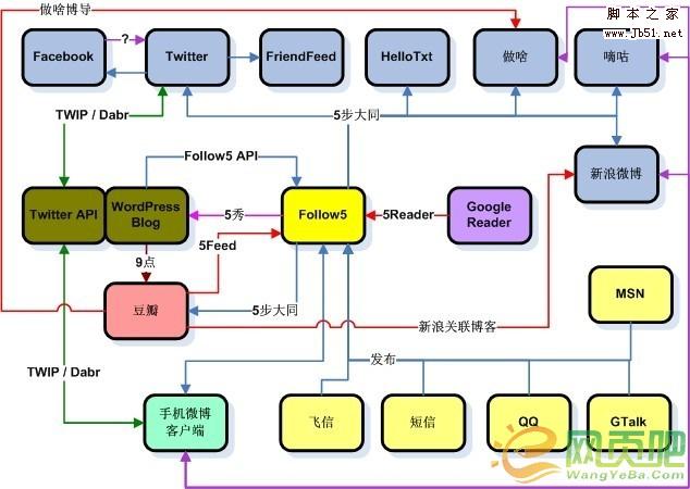 有點(diǎn)眼暈嗎?我第一次看見(jiàn)這張圖的時(shí)候也是相當(dāng)暈。Follow5.com恐怕是目前國(guó)內(nèi)市場(chǎng)上支持同步功能最全面的微博了,也是“同步控”們的最?lèi)?ài)。本文就以Follow5微博作為本文使用的網(wǎng)站。