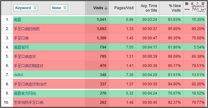 例如,下圖中,是某網(wǎng)站的Non-paid Search關(guān)鍵詞的Engagement指標(biāo)。這是一個(gè)非常有趣的例子,自然搜索流量的關(guān)鍵詞分為表現(xiàn)截然相反的兩組,一組是以“滴露”為核心的關(guān)鍵詞(綠色部分),另外一組是以“手足口病”為核心的關(guān)鍵詞(紅色部分)。其中,“滴露”這組,bounce rate的表現(xiàn)可以說是相當(dāng)理想,表明這些關(guān)鍵詞流量的landing page(登陸頁)內(nèi)容和設(shè)計(jì)相當(dāng)程度滿足了訪問者對于“滴露”這個(gè)搜索詞背后的訪問預(yù)期??上?ldquo;手足口病”這一組則不然,盡管“手足口病”一定是網(wǎng)站中經(jīng)常提及的內(nèi)容(否則不會(huì)有很好的排名,也就很難有這么大的流量),但訪問者搜索這個(gè)詞來到網(wǎng)站的頁面之后,landing page沒有給出這些訪問者所期待的內(nèi)容。