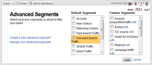 首先在Advanced Segments(高級細(xì)分群組)中選擇Non-paid Search Traffic。