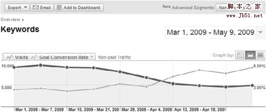 圖中的兩條線分別是Non-paid Traffic的總體visit,以及相應(yīng)的Goal Conversion Rate(即目標(biāo)轉(zhuǎn)化率)??梢钥吹?,隨著網(wǎng)站SEO策略的調(diào)整,SEO的流量下降了,但是SEO對網(wǎng)站收益的實(shí)際貢獻(xiàn)能力卻在增強(qiáng)(反映在不斷上揚(yáng)的目標(biāo)轉(zhuǎn)化率曲線上),這意味著網(wǎng)站SEO策略的更聚焦,以及更targeting(精確的)受眾來到你的網(wǎng)站上。這個(gè)曲線表明的結(jié)果并不是壞事!當(dāng)然,如果我們能看到流量不變低,而且目標(biāo)轉(zhuǎn)化率不斷走高,那就更好了!