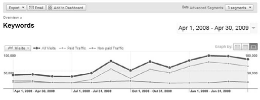 如果SEO做的好,那就能看到一個(gè)月比另一個(gè)月的Non-paid Search Traffic的Top Landing Pages的數(shù)量有所增加(甚至急劇增加)。比如,這個(gè)月是508,而下個(gè)月是530,那么不錯(cuò)!:) 我的博客(www.chinawebanalytics.cn)是這個(gè)情況,靠譜。