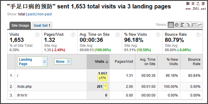 這是一個(gè)有些“極端的”例子,不過卻能說明問題。例如,如果我們發(fā)現(xiàn)某個(gè)關(guān)鍵詞的bounce rate非常高,我們應(yīng)該采取什么樣的方法進(jìn)行網(wǎng)站優(yōu)化/SEO優(yōu)化?一個(gè)常用的思路,哪里不好,就細(xì)分哪里!我肯定會(huì)毫不猶豫的按照landing page來細(xì)分某個(gè)“糟糕”關(guān)鍵詞的表現(xiàn),例如“手足口病的預(yù)防”這個(gè)關(guān)鍵詞。在Google Analytics中,我們得到如下的數(shù)據(jù)。
