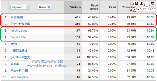 上圖中,貢獻(xiàn)流量排名第一的是“流量監(jiān)測”,第二的是“網(wǎng)站分析在中國”,可惜,這兩個(gè)關(guān)鍵詞帶來的流量雖然不錯(cuò),可是帶來的收益卻不如排在第三、第四位的兩個(gè)關(guān)鍵詞。很明顯,我的博客在“流量監(jiān)測”方面所作的SEO優(yōu)化不錯(cuò),因?yàn)槲页3U勂疬@個(gè)東西,但是我認(rèn)為,相當(dāng)一部分訪問者對于“流量監(jiān)測”的期望并不是“網(wǎng)站流量監(jiān)測”,而是“廣告流量監(jiān)測”,這實(shí)際上造成了他們期望和實(shí)際訪問內(nèi)容的不匹配,并最終拉低了這個(gè)關(guān)鍵詞在我的網(wǎng)站中產(chǎn)生的收益。