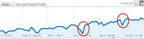 例如上面這個(gè)圖中,顯示的是Non-paid Search Traffic(非付費(fèi)的搜索引擎流量)的周度趨勢情況,從Google Analytics的Advanced Segments中你能夠很容易的得到這個(gè)報(bào)告。圖表中的趨勢很明顯,流量穩(wěn)步上升,說明SEO的表現(xiàn)不錯(cuò)。不過,對于網(wǎng)站分析中的趨勢分析,永遠(yuǎn)值得注意的是“outliers”,即例外情況。這個(gè)趨勢中有幾個(gè)明顯的“缺口”,第一個(gè)缺口是因?yàn)榇汗?jié),第二個(gè)缺口則并不是因?yàn)檫^節(jié),而是其他原因造成的,研究造成這個(gè)缺口的原因,能夠幫助我們進(jìn)行更好的SEO。