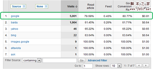 從這個(gè)例子中,我們可以看到的是,利用網(wǎng)站分析評估SEO的收益,能夠幫助我們進(jìn)一步辨識SEO的價(jià)值和機(jī)會(huì)。下圖中是另一個(gè)關(guān)于SEO收益評估的例子,是我博客的SEO按照搜索引擎細(xì)分的收益情況,由于不是電子商務(wù)網(wǎng)站,因此我的Goal的定義是“Read article”(進(jìn)入我的網(wǎng)站點(diǎn)擊并閱讀我的文章)以及Feed(即提交RSS訂閱)。我也給我的博客做了一點(diǎn)點(diǎn)monetize(貨幣化)的工作,即假設(shè)閱讀我的文章給我的收益是1美元,而訂閱我的博客是5美元,這樣就有一列“Per Visit Goal Value”的數(shù)據(jù),顯然這個(gè)數(shù)據(jù)越大越好。
