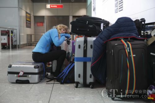 在英國航空公司上周六取消數(shù)百架次航班后,希斯羅機場的一名乘客靠著行李箱睡覺。
