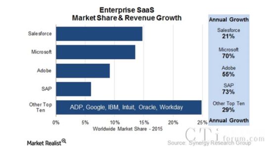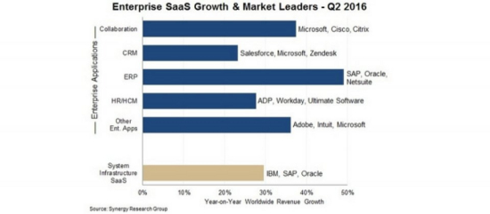 盡管以全球企業(yè)SaaS市場規(guī)模來看,2016年第2季全球企業(yè)SaaS市場營收相較于2015年第2季成長了33%,且超過110億美元。未來5年內(nèi),全球企業(yè)SaaS市場規(guī)模將成長3倍以上。但是人們永遠只記得住金字塔頂端的選手。