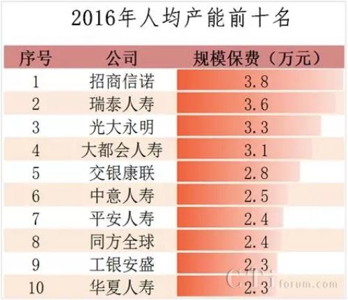 從各公司來(lái)看,人均產(chǎn)能前十名有七家為外資公司,其中,招商信諾人壽、瑞泰人壽和中美聯(lián)泰大都會(huì)人壽人均產(chǎn)能均在3萬(wàn)元以上。