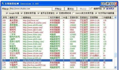 軟件操作非常簡(jiǎn)單,運(yùn)行軟件后只需輸入自己網(wǎng)站的網(wǎng)址,點(diǎn)擊“開始”后便自動(dòng)開始檢測(cè)。軟件自動(dòng)檢測(cè)對(duì)方網(wǎng)站的收錄、PR值等信息。如果嫌軟件太麻煩,還可以登錄tools.jb51.net,進(jìn)行在線檢測(cè)。