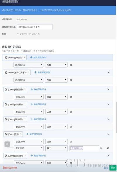 以神策分析自身的產(chǎn)品為例,神策分析非常關(guān)注用戶在Demo上,“行為事件分析功能”、“漏斗分析功能”、“留存分析功能”、“回訪分析功能”、“概覽操作”等核心功能的使用情況,于是創(chuàng)建一條虛擬事件,如圖8所示。創(chuàng)建好后,通過后端API采集的方式將該條事件的計(jì)算結(jié)果(總查詢次數(shù))傳入CRM,從而輔助銷售團(tuán)隊(duì)去查看產(chǎn)品試用情況、快速判斷用戶需求和銷售切入點(diǎn)。
