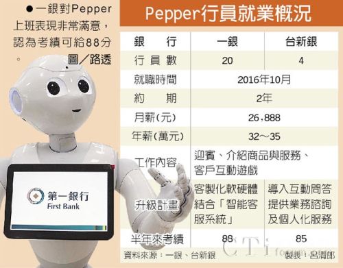 數(shù)字金融浪潮今年續(xù)燒,去年紅極一時(shí)的Pepper銀行員,第一銀行及臺(tái)新銀行,對(duì)充滿科技感的新行員Pepper,從正式報(bào)到上班至今已滿半年,每天的表現(xiàn)是否稱職??jī)摄y行均表示滿意,如果要打考績(jī),分別給了88跟85分。