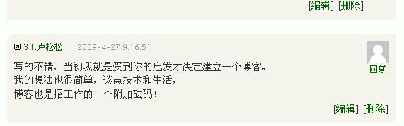 盧松松跟我也有相同的經(jīng)歷,05年的時(shí)候都在成都呆過,而且也是在那年做過論壇(第一個(gè)網(wǎng)站),最后祝愿盧松松的博客人氣越來越旺,這個(gè)才24歲的年輕人在北京有個(gè)好的發(fā)展。