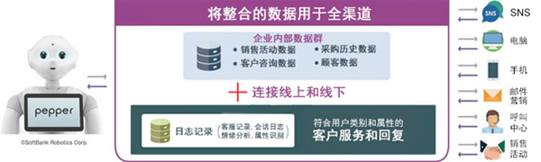 “Pepper機器人營銷”能夠根據(jù)企業(yè)使用機器人服務(wù)的目的和場景,導(dǎo)入話術(shù)、動作等機器人UX設(shè)計,并且能夠積累和運用以前難以可視化的客服歷史記錄作為數(shù)據(jù)資產(chǎn)。同時,積累的數(shù)據(jù)將反應(yīng)到在線FAQ、呼叫中心等客戶服務(wù)渠道中,并連接到云服務(wù)、數(shù)據(jù)庫和人工智能等API以擴展機器人的功能。